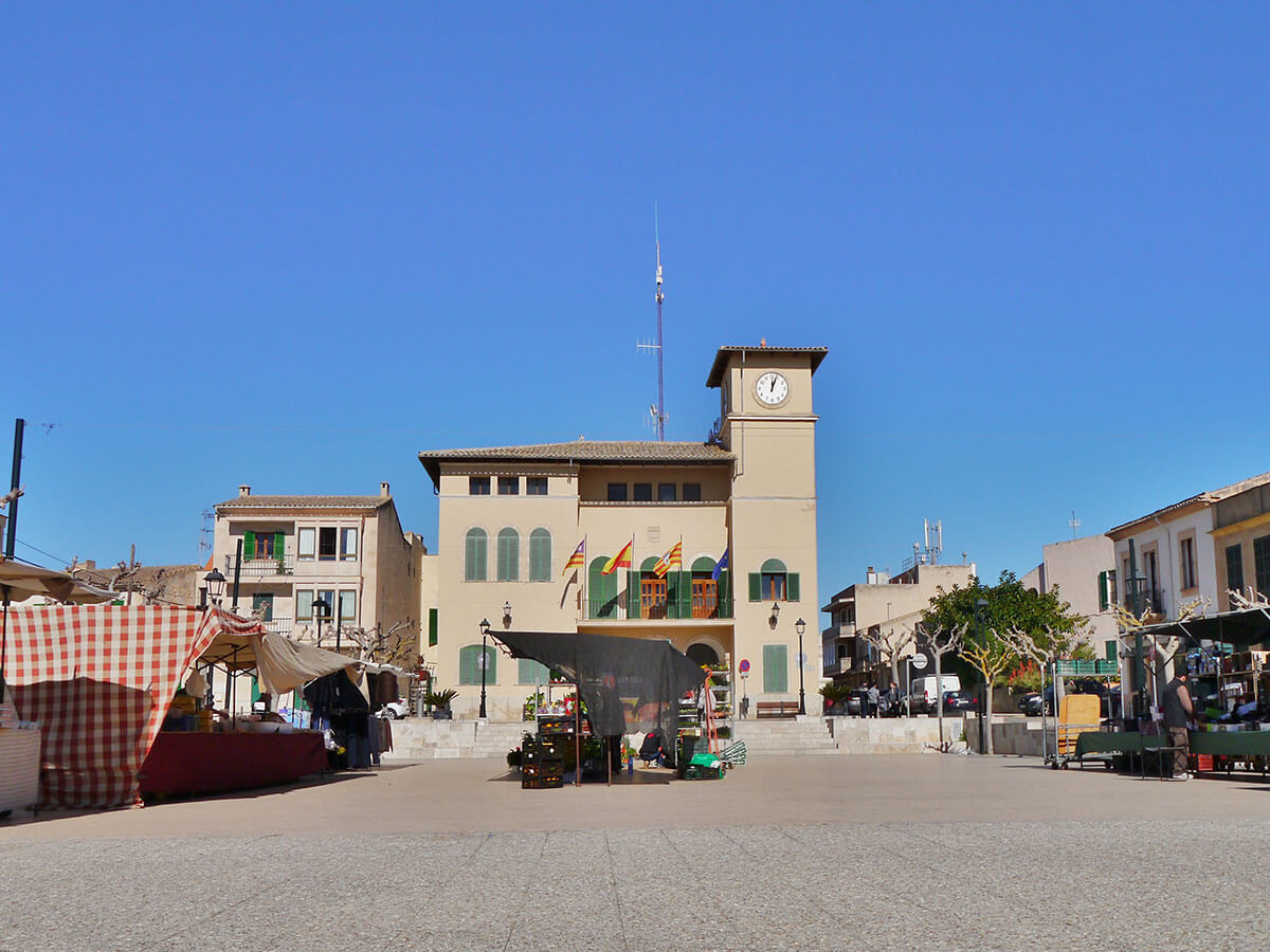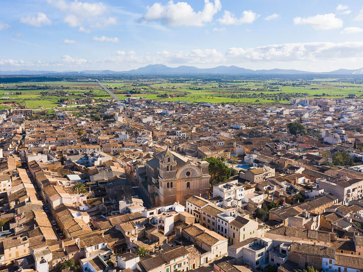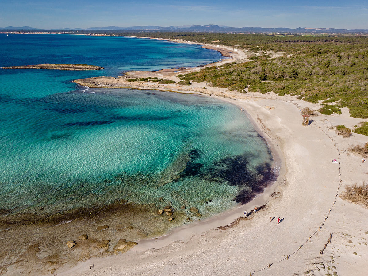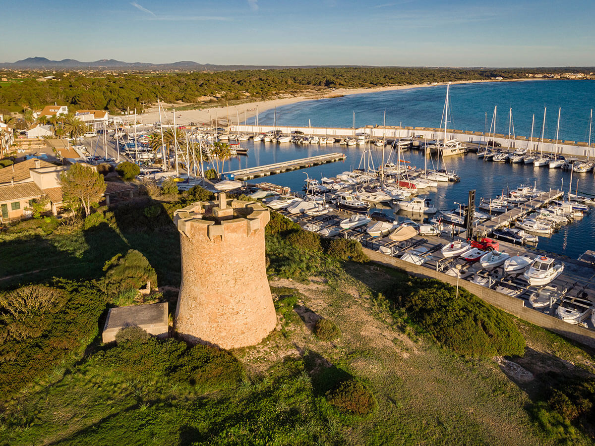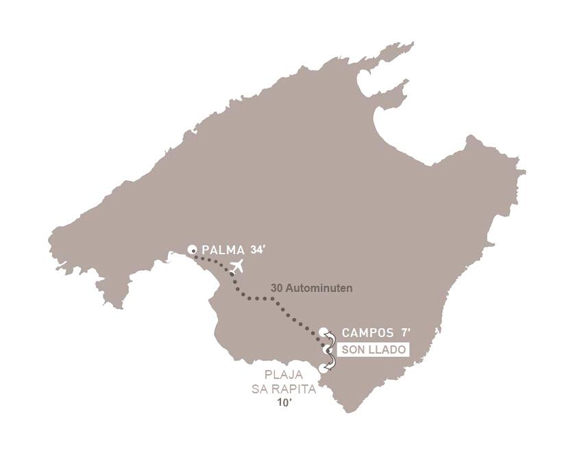 Die Stadt Campos liegt im Südosten der Insel, das exklusive Landhaus-Ensemble auf halben Weg zur Küste. Hier erreichen Sie direkt Es Trenc, einen der schönsten Strände mit einzigartiger Dünenlandschaft.